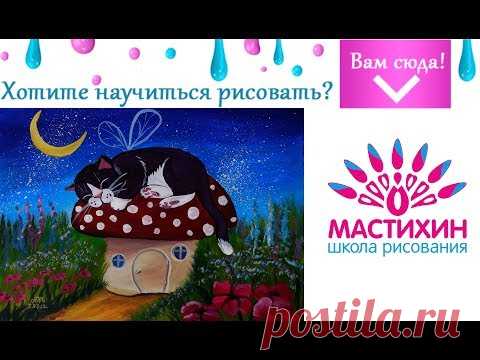 Быстрое рисование Живопись гуашью Рисуем Котика на мухоморе гуашью Сон лунной ночью