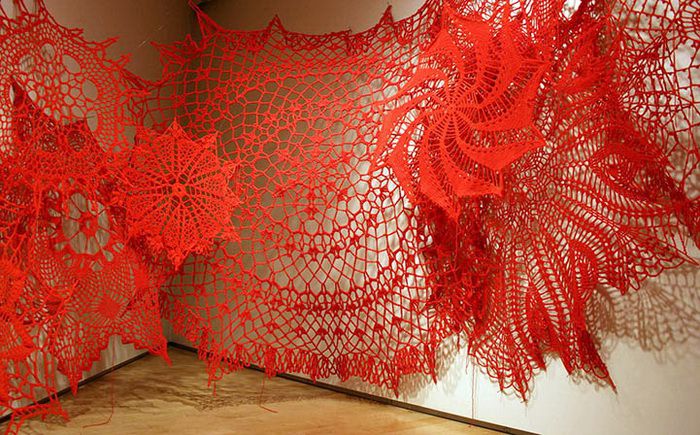 Красное кружево на стенах выставочного зала: гигантская вязаная инсталляция | Современное искусство | Арт