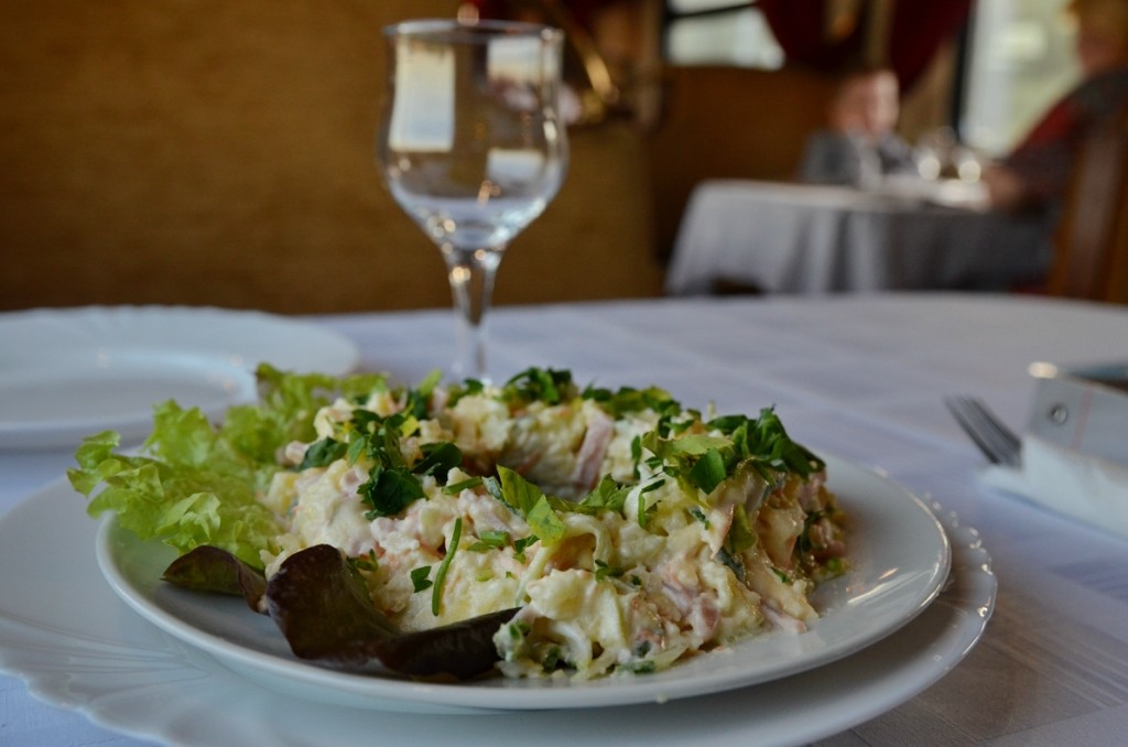 Салат пассажирский В шестидесятых это блюдо подавали в вагонах-ресторанах. В салате всего три основных продукта, плюс неизменная заправка – майонез. Делали его из говяжьей печени, которую сначала обжаривали крупными кусочками, а затем нарезали соломкой. Соленые огурчики нарезали таким же способом. Лук, нашинкованный полукольцами, пассировали. Затем все это перемешивали, солили, перчили и добавляли волшебный «Провансаль».
