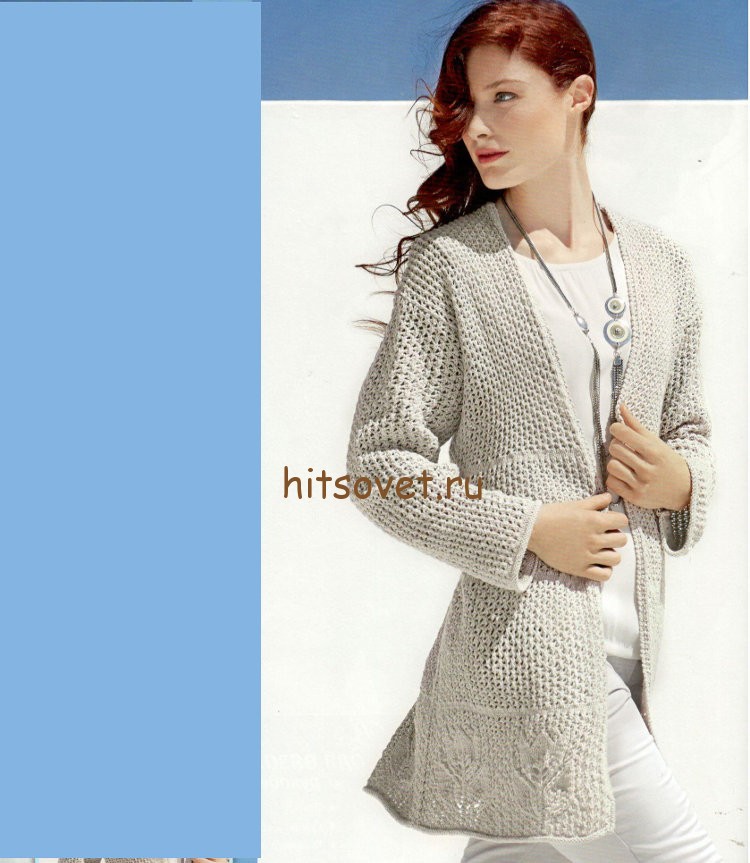 Кардиган с красивым узором спицами - Хитсовет Кардиган с красивым узором спицами. Модный стильный кардиган 2016 для женщин со схемами и бесплатным описанием. Вам потребуется 600 (650, 700) грамм светло-бежевой пряжи Eiastico Lana Grossa, состоящей из 96% хлопка, 4% полиэстера, длиной нити 160 метров в 50 граммах; спицы № 4, крючок № 3,5.