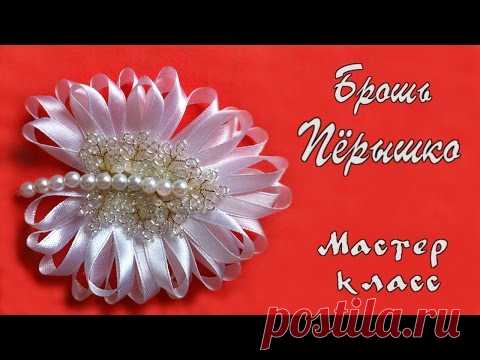 Брошь Перышко из атласных лент, бисера и бусин. Мастер класс. Brooch Feather of satin ribbon канзаши