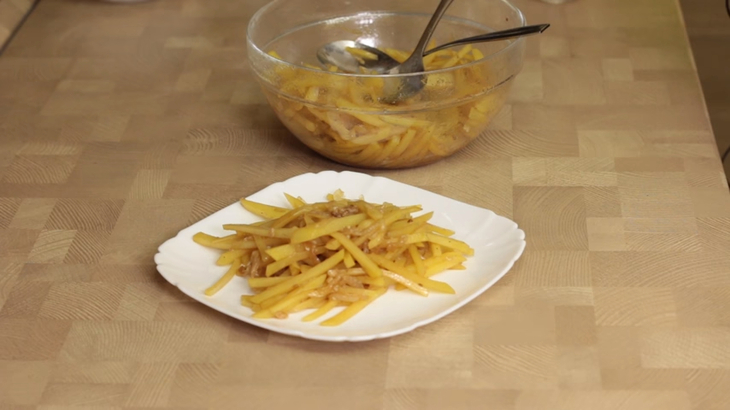 - Картофель нарезать тонкой соломкой. Для этого можно использовать терку для корейской моркови или просто нарезать его ножом. Толщина примерно 2-3 мм. Нарезанный картофель промыть холодной водой и оставить на 10 минут в холодной воде. Полукольцами нарезать лук и поставить на плиту воду, чтобы был кипяток. На сковороде разогреть растительное масло и на сильном нагреве обжарить лук. Картофель выложить в кастрюлю, залить кипятком, поставить на плиту и довести до кипения. После этого откинуть и промыть холодной водой. Он должен оставаться чуть-чуть сыроватым. Переложить его в салатницу, добавить выдавленный чеснок, красный и черный перец, кориандр, соевый соус и жареный лук вместе с маслом. Все аккуратно перемешать. Салат «картофель по-корейски» готов.