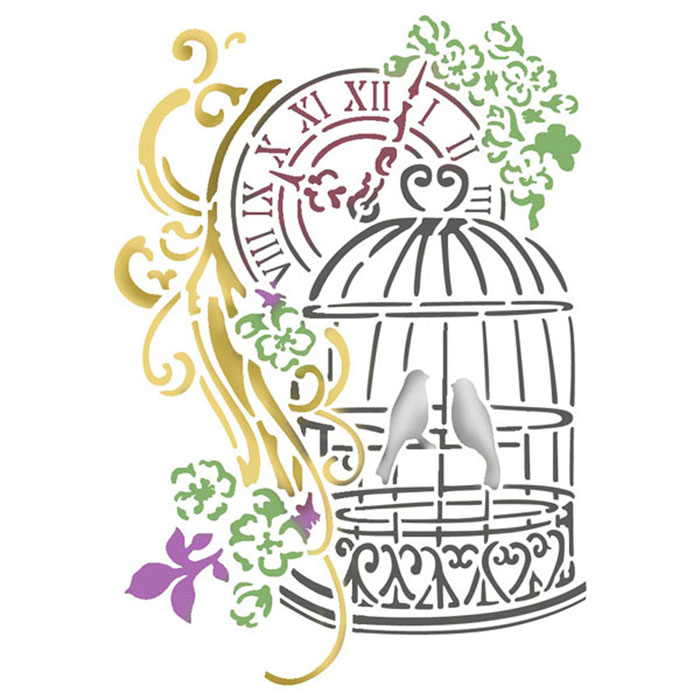 Трафареты для росписи и декупажа Птицы в клетке и часы Stamperia, трафаретные кисти и клей для фиксации трафаретов | интернет магазин Арт-Декупаж