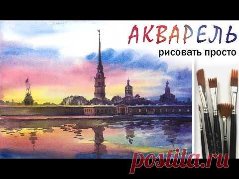 Как нарисовать ПЕЙЗАЖ "Закат. Санкт-Петербург" акварель Рисуем отражение, воду, город для начинающих