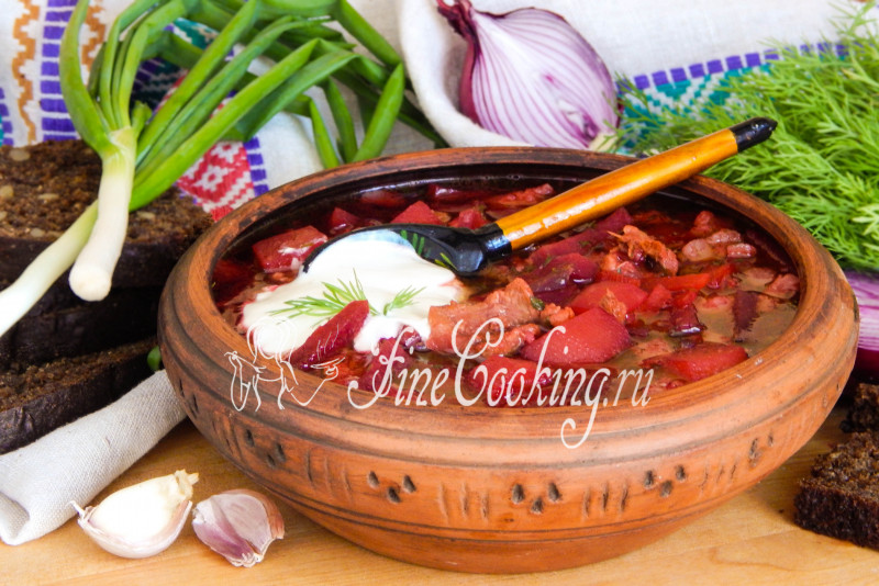 - В рецепт этого вкусного первого блюда входят такие ингредиенты: вода, свинина на косточке, свекла, картофель, морковь, лук репчатый, соленое свиное сало, свиной жир (смалец), свежий чеснок, укроп, лавровый лист, черный молотый перец, соль, столовый уксус, сахарный песок. Кстати, у меня в закромах есть рецепт чудесной заправки для борща (уже готового полуфабриката на зиму) - смотрите здесь.