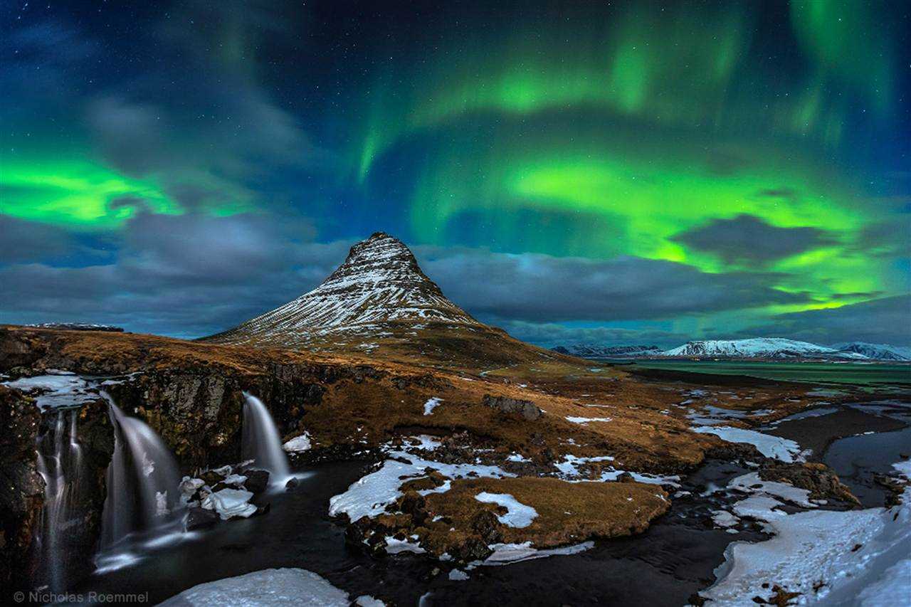 Гора Киркьюфелл и водопад на фоне северного сияния в Исландии