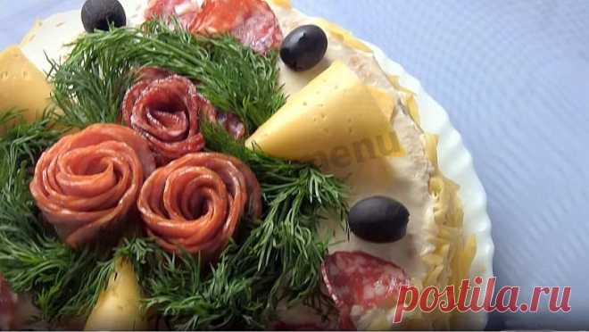 - Шаг 1: Каждый корж раскатать толщиной 4-5 мм. Вырезать круг диаметром 22-26 см. Наколоть коржи вилкой. Перенести коржи на противень, застеленный пергаментной бумагой.Шаг 2: Выпечь 5 коржей до готовности и остудить.Шаг 3: Начинка №1: Сыр и яйца натереть на крупной тёрке. Добавить мелко рубленный чеснок, майонез и перемешать.Шаг 4: Выложить начинку №1 на первый корж. Распределить по всей поверхности коржа и накрыть вторым коржом.Шаг 5: Начинка №2: Мелко нарезать ветчину, укроп. Добавить плавленный сыр, поперчить и перемешать.Шаг 6: Выложить начинку на второй корж и накрыть третьим.Шаг 7: Начинка №3: Грибы мелко нарезать, добавить майонез и перемешать.Шаг 8: Выложить начинку на третий корж и накрыть четвертым.Шаг 9: Начинка №4: Лук нарезать мелко, морковь натереть на крупной терке и обжарить до готовности, остудить.Шаг 10: Добавить плавленный сыр, поперчить, посолить и перемешать.Шаг 11: Выложить начинку на четвёртый корж и накрыть пятым.Шаг 12: Торт накрыть пленкой, слегка придавить руками. Положить в холодильник на 3 часа.Шаг 13: Плавленный сыр соединить с майонезом и этим "кремом" обмазать бока и вверх торта. Поставить в холодильник на сутки для пропитки.Шаг 14: Торт украсить по желанию. Твёрдый сыр натереть на крупной тёрке и обложить им бока торта.Шаг 15: Колбасу тонко порезать, выложить рядком и оформить розочкой.Шаг 16: Скрепить розочку шпажками.Шаг 17: Низ розочки ровно обрезать.Шаг 18: Выложить розочки на торт.Шаг 19: Твёрдый сыр нарезать тонкими пластинами. Аккуратно свернуть "кулёчком".Шаг 20: Выложить "кулёчки" на торт. В каждый "кулёчек" вложить оливку.Шаг 21: Ломтики колбасы разрезать до середины.Шаг 22: Развернуть концы колбасы в разные стороны.Шаг 23: Выложить по краю торта. А также положить оливки и веточки укропа.Шаг 24: Вот такой торт в разрезе.Шаг 25: Приятного аппетита и красивого праздника!