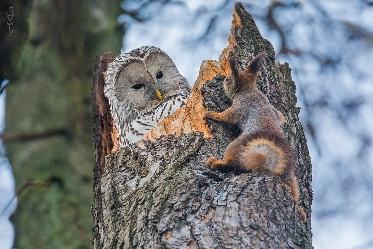 Длиннохвостая неясыть со своей нахальной соседкой – белкой
