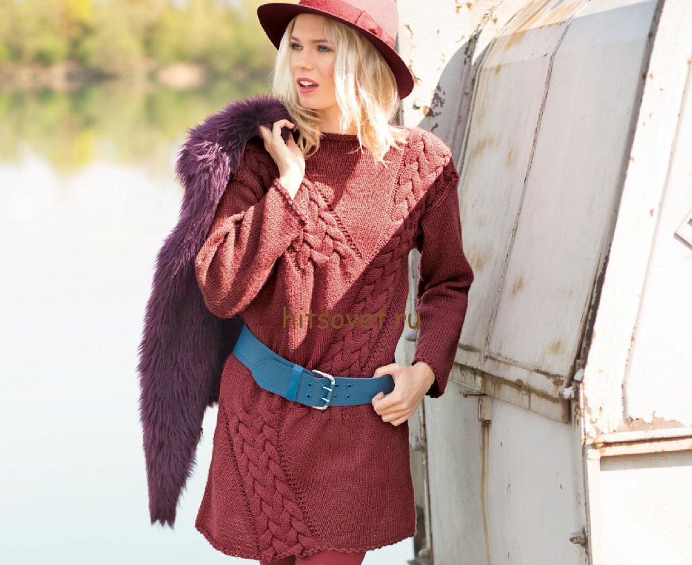 Туника с косами спицами - Хитсовет Туника с косами спицами. Модная модель женской туники с эффектными диагональными косами с описанием и схемой вязания. Вам потребуется: 750 (800) грамм красно-коричневой пряжи, состоящей из 50% натуральной шерсти, 50% полиакрила; длиной нити 80 метров в 50 граммах ; спицы № 5; круговые спицы № 5.
