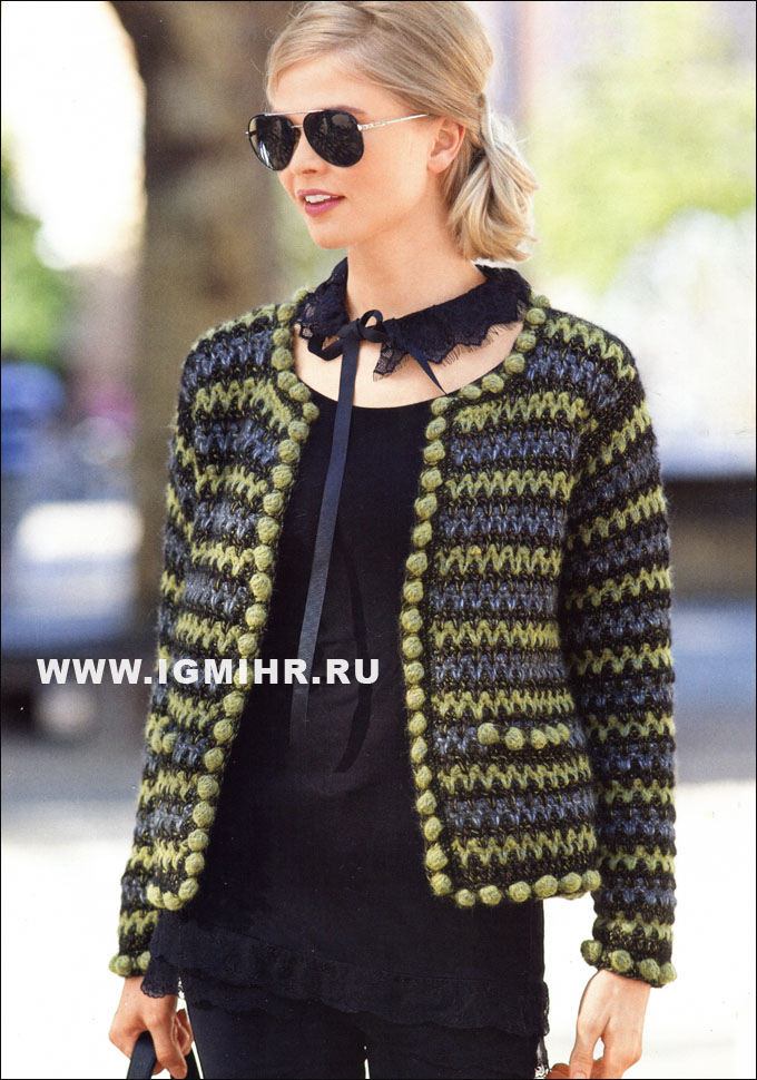 В стиле Шанель. Жакет с трехцветным зубчатым узором и декоративными планками из шишечек. Крючок