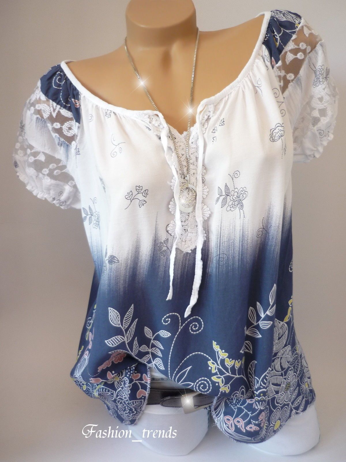 Italy Vintage Blumen Bluse Sommer Shirt Top Tunika Lagenlook*Weiss Blau*38 40 42…