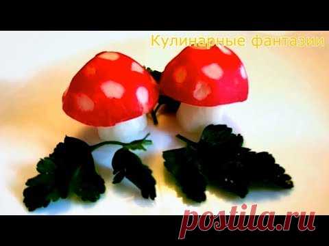 Милые грибочки из редиса! Роза из помидора! Украшения из овощей!