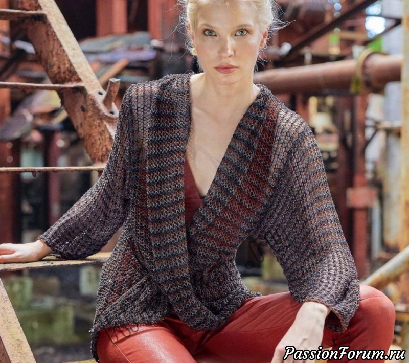 Пуловер с эффектом запАха - запись пользователя Лисик (Светлана) в сообществе Вязание спицами в категории Вязание для женщин спицами. Схемы вязания спицами Вам потребуется: по 100 (100, 150) грамм ржаво-красной, темно-шоколадной и серой пряжи, состоящей из 75% хлопка, 25% полиамида, длиной нити 200 метров в 50 граммах; спицы № 3,5; крючок № 3. Размеры пуловера: 36-38 (40-42, 44-46).