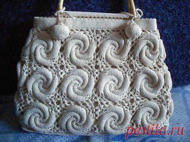 Сумка из объемных мотивов При взгляде на эту необычную вязаную сумку сразу приходит на ум море с его волнами и завихрениями. Сейчас такие изделия вяжут многие мастерицы – крючком или спицами, из тонких ниток или тол…