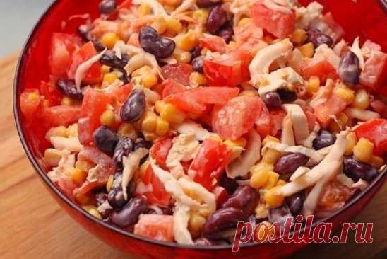 Салат с курицей, фасолью и овощами 80 ккал на 100 грамм Вам понадобится: Куриное филе (приготовленное) — 1 шт. Пекинская капуста — 100 г Помидоры красные — 200 г Кукуруза консервированная — 300 г Фасоль красная в собственном соку — 300 г Чеснок дольки — 2 шт. Йогурт — 50 г Приготовление: Филе порежьте на кусочки. Китайский салат тонко нарежьте. Помидоры нарежьте кубиками. Добавьте фасоль и кукурузу, предварительно слив сок из банок. Добавьте мелко нарезанный чеснок, йогурт. Посолите по вкус