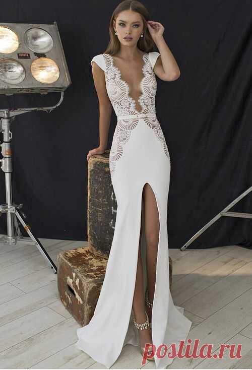 Настоящей сенсацией станет платья с разрезом в районе бедра, которое может эффективно выглядеть в сочетании со стройными ножками невесты. Идеально выглядит разрез на прямой, длинной юбке без лишнего декора. При этом акцент делается на верхе. Это могут быть кружевной корсет, или же изысканные кружевные рукава. Такое платье обязательно сочетать с туфлями на высоком каблуке.