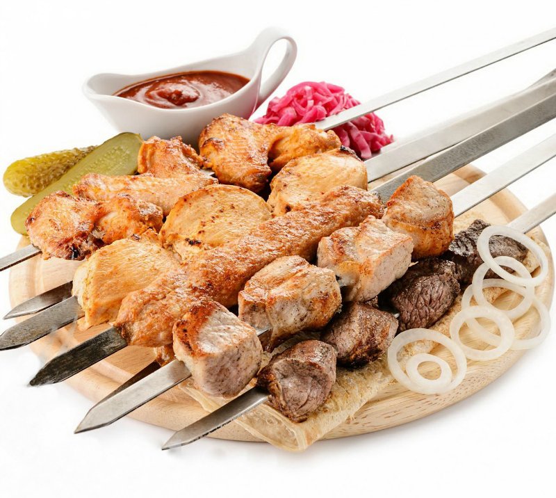 Шашлычки из курицы и свинины с разными соусами