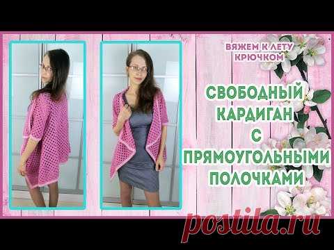 Ажурный кардиган крючком с прямоугольными полочками и летящей спинкой. Вяжем к лету крючком
