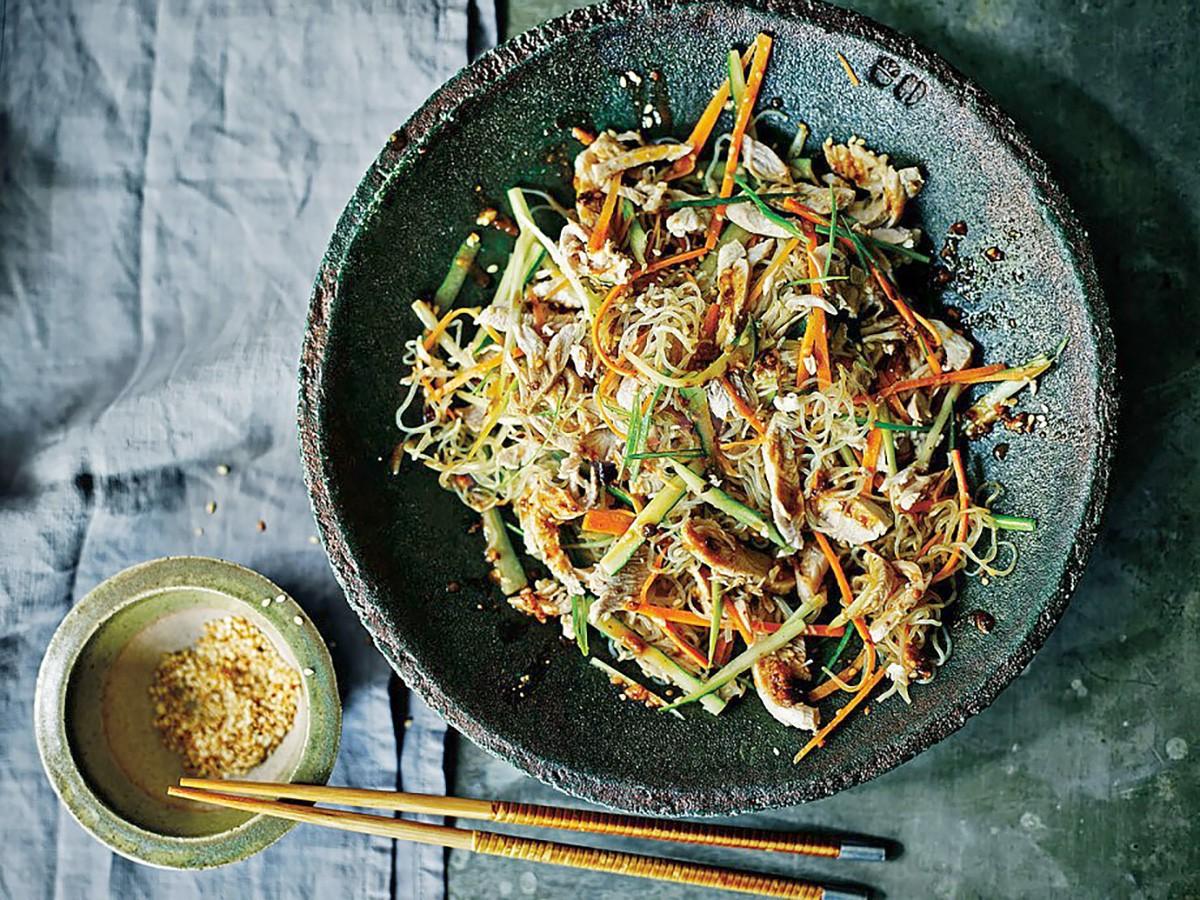 - 1. Фунчозу выкладываем в миску, заливаем горячей водой. Оставляем примерно на 5 минут. За это время лапша смягчится, но при этом остается аль денте. Итак, сливаем воду, а лапшу выкладываем на бумажное полотенце, пусть обсохнет. 2. В кастрюлю наливаем воду, отправляем на огонь. Когда вода закипит, выкладываем в нее курицу и варим в течение 7-10 минут. После чего извлекаем мясо из кастрюли. Даем куриной грудке немного остыть, а затем нарезаем на тонкие кусочки. 3. Морковь очищаем, моем. Огурец моем, отрезаем концы с обеих сторон. Если огурец молодой, кожицу очищать не нужно. Натираем морковь и огурец на терке для овощей по корейски. Также можно порезать тонко с помощью обычной овощечистки, получится ничуть не хуже. 4. Репчатый лук очищаем, нарезаем тончайшей соломкой. Лучше всего с этим справится острый нож. 5. Семена кунжута обжариваем на сухой сковороде (без добавления масла) в течение 2-3 минут. Они должны стать ароматными и приобрести золотисто-коричневый цвет. 6. Подготовим заправку. В небольшую миску или в сотейник наливаем соевый соус. Сюда же наливаем уксус и куриный бульон (можно использовать тот, в котором варилась грудка). А теперь насыпаем сахар, добавляем кунжутную пасту, кунжутное и растительное масло. Остается приправить заправку перцем и перемешать. 7. Выкладываем в глубокий салатник фунчозу, курицу, морковь, огурец и лук. Поливаем все ингредиенты подготовленной заправкой, перемешиваем. 8. Затем сервируем салат на стол, при этом посыпаем обжаренными семенами кунжута. Ну вот, блюдо готово. Кушайте на здоровье!