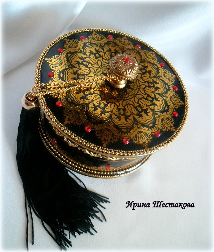 Шкатулочка «Тысяча и одна ночь». Декупаж, фурнипаж, стразы. Внутри обивка бордовым стрейч-бархатом. Кисть ручной работы, съемная