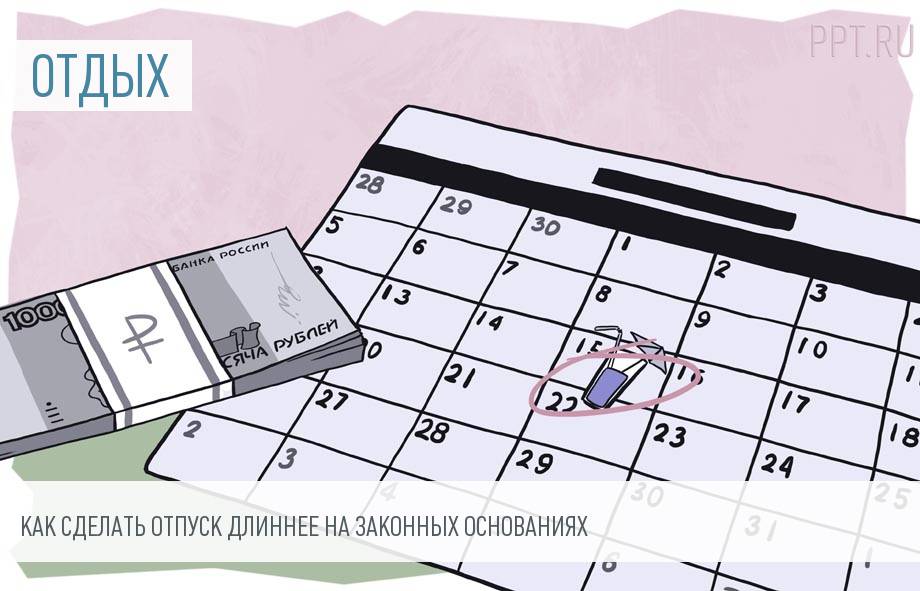 Как добавить к отпуску от 1 до 10 дней за счет работодателя Слово «отпуск» летом звучит иначе, чем зимой, и, явно по-разному — для работников и их работодателей. Если первые хотят выбрать время поудобнее и отдохнуть подольше, то вторые озабочены тем, как компенсировать трудовые функции отдыхающих сотрудников. Так как же сделать свой отпуск хоть немного длиннее, не потеряв при этом в зарплате и отпускных?