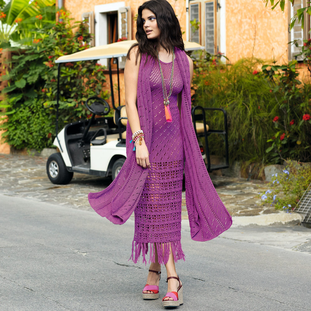 Ажурное платье и шарф цвета фуксии Платье в смешанной технике вязания (верх выполнен на спицах, а низ — крючком) дополнено длинным широким шарфом. Отличный комплект для лета!