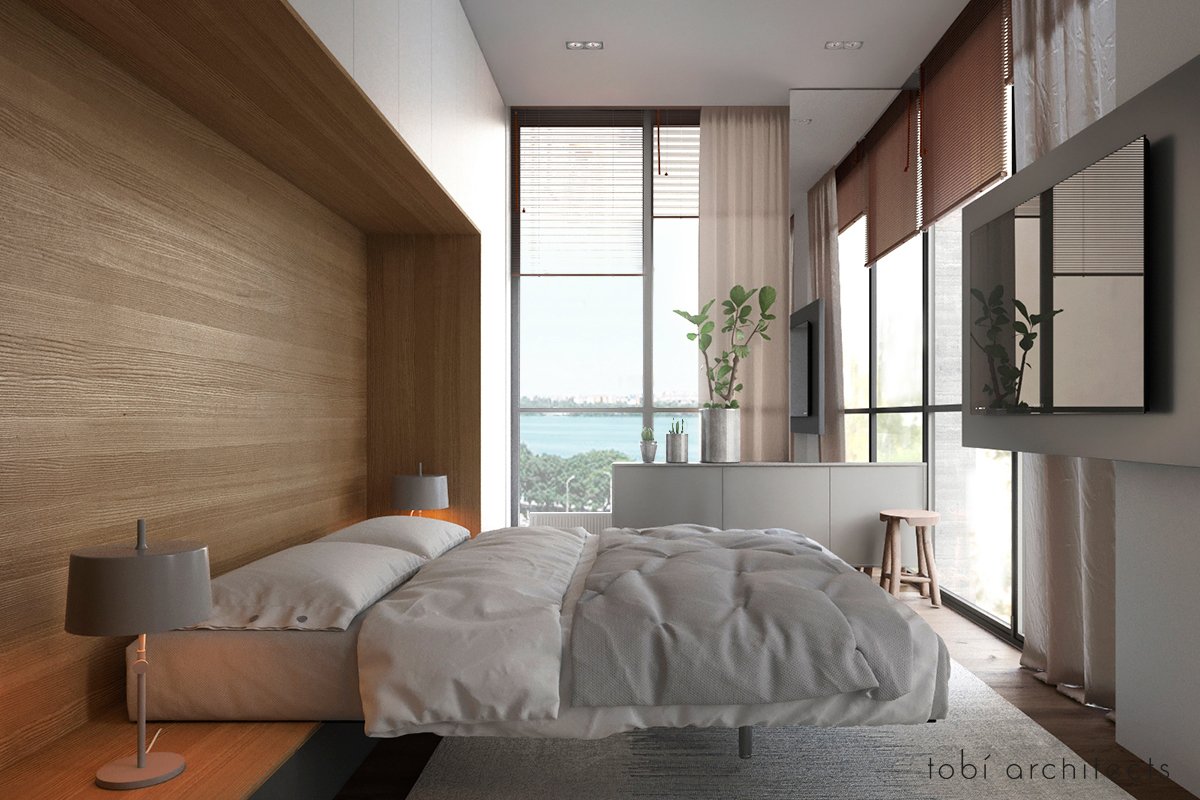 Было предложено создать лаконичный дизайн интерьера — LOOKING AT DNIPRO, для апартаментов, с прекрасным видом на реку Днепр. Благодаря панорамным окнам – комнаты наполнены светом и теплом. Прихожую ми предложили отделить перегородкой из деревянных реек. Данное решение позволило использовать как функционального элемента и декорации. Еще одна особенность интерьера — кухня, которая «оторвана» от пола. Это решение позволило добавить легкости и воздушности дизайну.