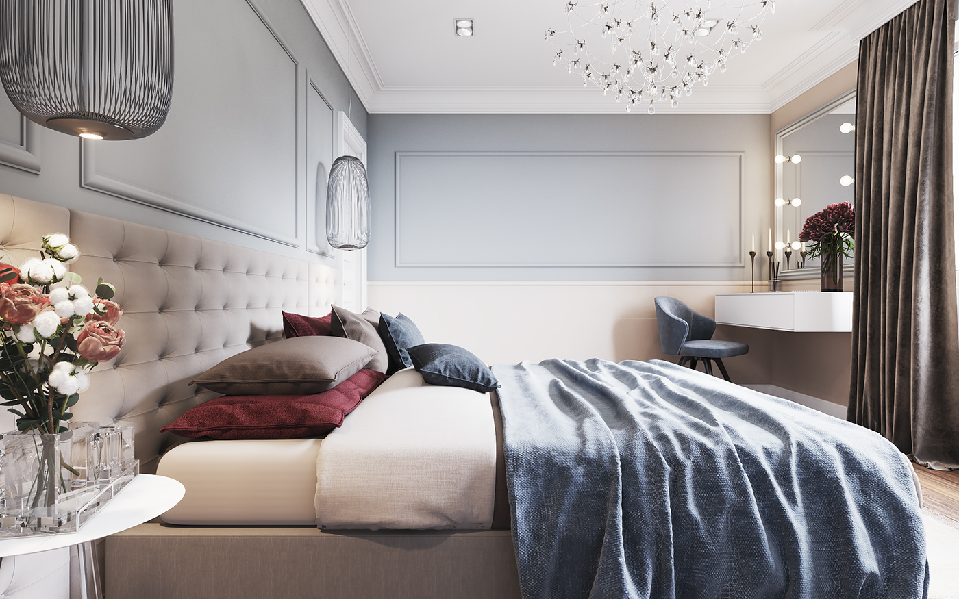 В дизайне спальни — основные цвета пастельные, а цветовые акценты — в текстиле.