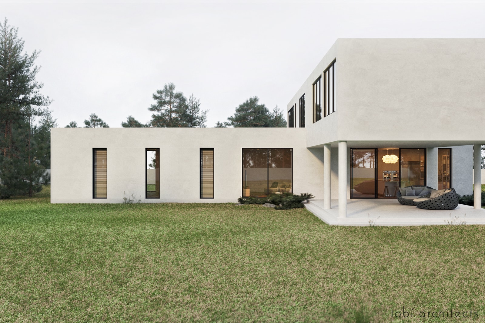 Белоснежный строгий дом стоит на обширном участке в окружении соснового леса. Просторный и минималистичный,в стиле раннего модернизма, он создан для единения с природой, отдыха и созерцания. Архитектурный образ здания построен на контрастном сочетании его горизонтальных объёмов и вертикалей окружающих сосен. Таким образом все жилище – это прекрасная обзорная площадка.