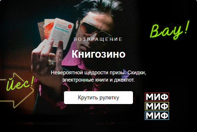 Возвращение самой азартной из всех книжных игр, легендарного Книгозино. Каждую неделю в Книгозино — новая партия бесплатных спинов и призы невероятной щедрости, так что заходите почаще —