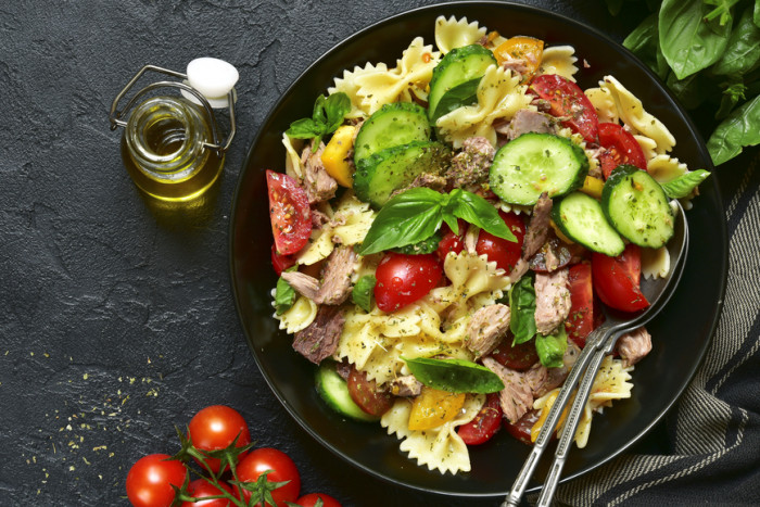 Салат из макарон с тунцом и овощами Приготовленный по нашему рецепту салат из макарон с тунцом, овощами и базиликом – отличная идея для вкусного легкого ужина.