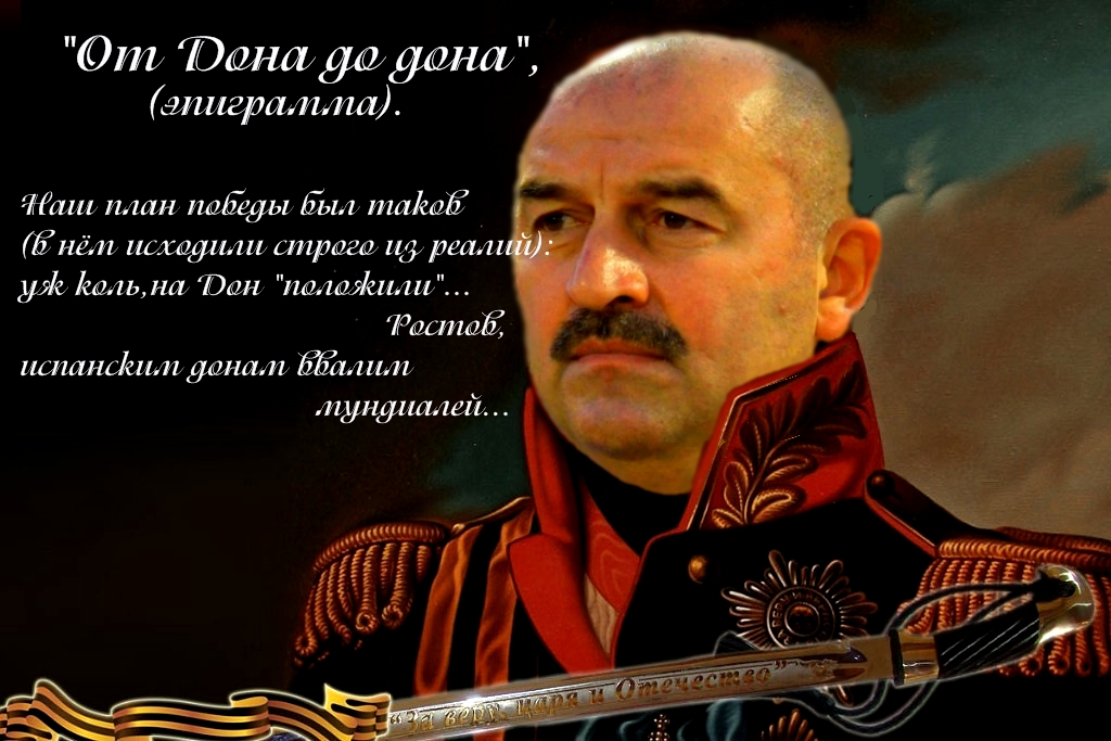 "От Дона до дона". (эпиграмма) Наш план победы был таков (в нём исходили строго из реалий): уж коль,на Дон "положили"...Ростов, испанским донам ввалим мундиалей...