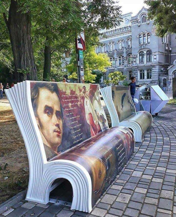 Одесса радует креативом! Новый арт-объект жемчужины у моря - литературные скамейки, которые украшают парк имени Тараса Шевченко. Каждая в форме развернутой книги. На них можно не только посидеть и прочитать цитаты из произведений великого украинского классика, но и насладиться иллюстрациями к ним. Стоит отметить, что такие «литературные лавочки» пришлись по вкусу одесситам, которые с радостью фотографируются на их фоне.