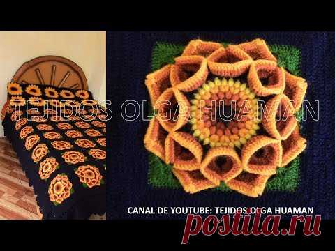 Cuadrado a muestra de flor a crochet para colchas en punto garbanzos y puntos altos