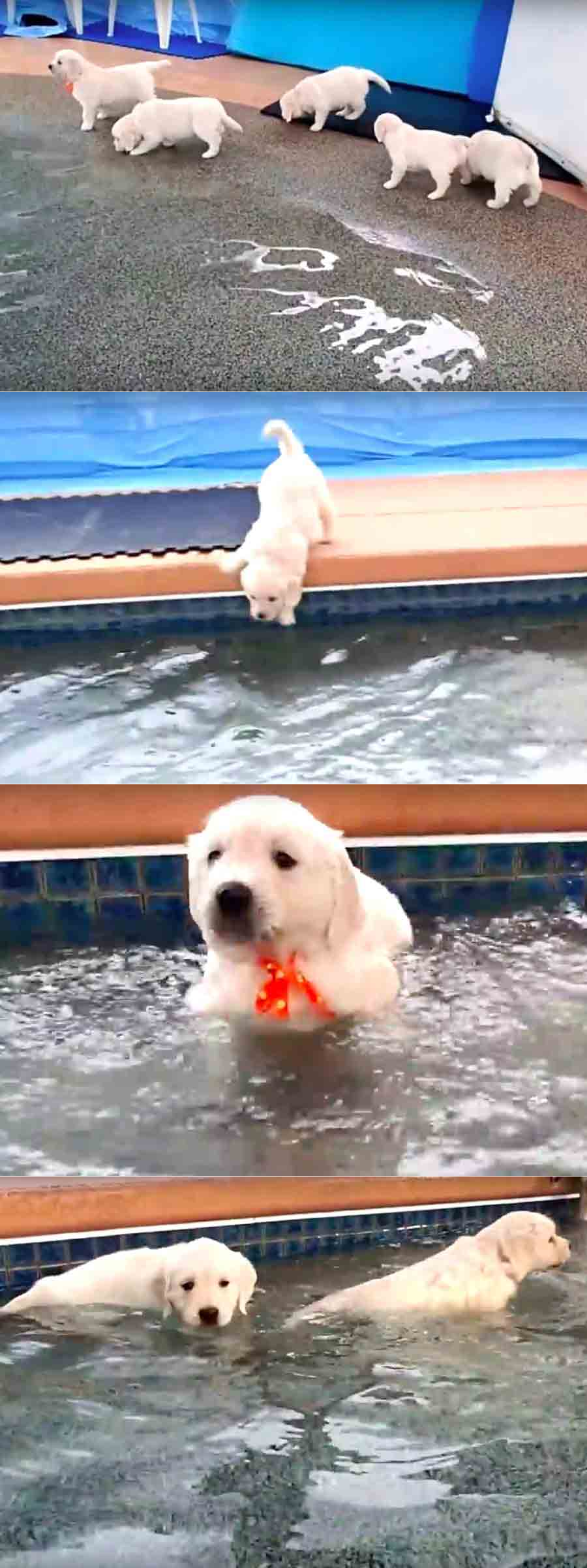 Щенки золотистого ретривера впервые видят бассейн и знают, что делать