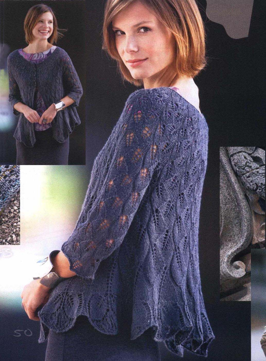 Короткий и длинный жакет с узором листики спицами