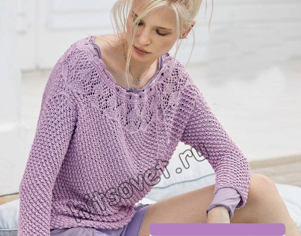 Пуловер с ажурной кокеткой - Хитсовет Вязание спицами для женщин женского пуловера с персидским узором и ажурной кокеткой по кругу со схемой и пошаговым бесплатным описанием вязания. Размеры пуловера: 38-40 (42-44, 46-48). Вам потребуется: 400 (450, 500) грамм сиреневой пряжи, состоящей из 55% шелка, 45% хлопка; длиной нити 150 метров в 50 граммах; спицы № 3,5; круговые спицы №3,5. Персидский ажурный …