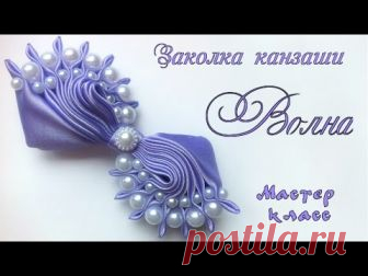Заколка Волна канзаши из атласных лент с бусинами. Hairpin sea Kanzash from satin ribbon with beads