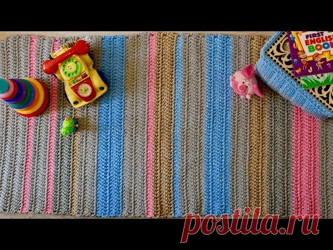 ПРЯМОУГОЛЬНЫЙ КОВРИК КРЮЧКОМ из трикотажной пряжи. ПОЛОСАТЫЙ КОВЁР КРЮЧКОМ. Как вязать коврик