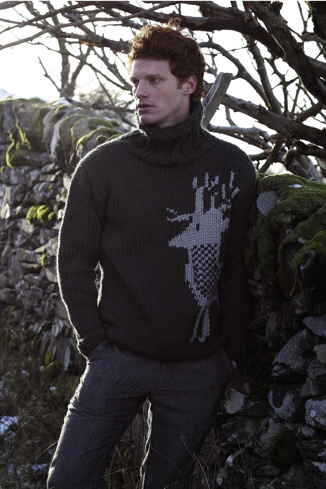 Джемпер с оленем Hornshaw, Rowan Dalesmen Вязание для мужчин джемпера с оленем спицами из журнала Rowan Dalesmen. Мужской джемпер, вязаный спицами с большим мотивом оленя, из толстой шерстяной пряжи.