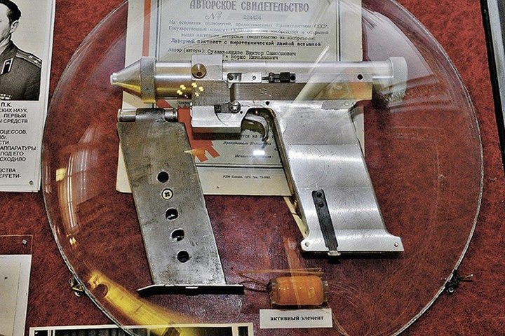Советский лазерный пистолет В 1984 году в СССР был разработан лазерный пистолет несмертельного действия. Он предназначался для самообороны космонавтов. Поражающее действие этого пистолета заключалось в выведении из строя чувствительных элементов оптических систем, в том числе глаз человека. А важным преимуществом по сравнению с обычным пистолетом в условиях невесомости было отсутствие отдачи. Сейчас «Космический бластер» — самый популярный экспонат в Музее истории военной академии РВСН.