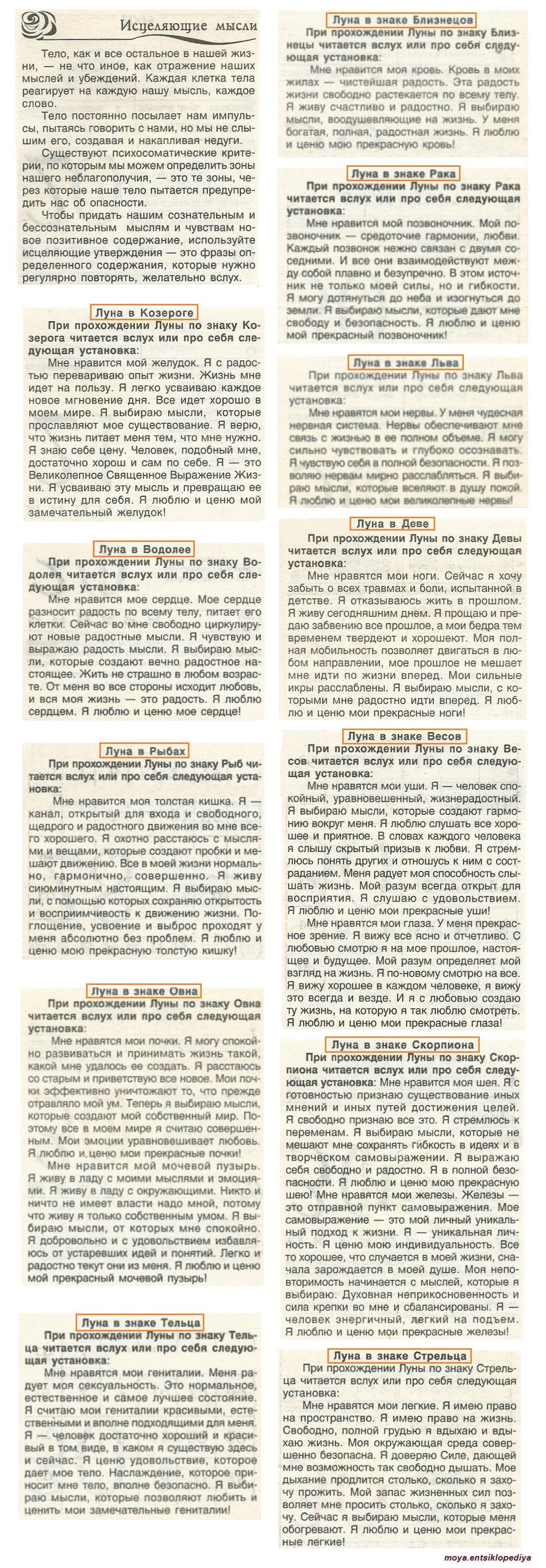 Исцеляющие мысли при прохождении Луны по знакам зодиака