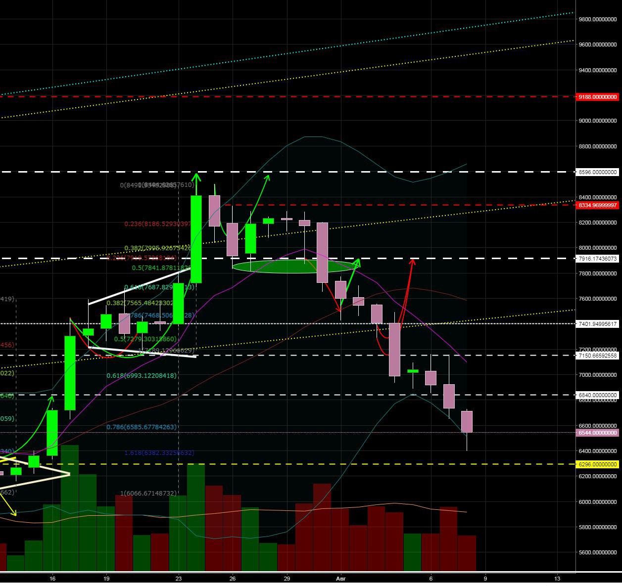 Вот так запросто одна новость от SEC сломала все возможные поддержки и опустила цену на 0,78 по Фибо, также она развернула индикаторы фактически всех и пробила вниз поддержки многих альткоинов. Ждем закрытия дня, на BTC индикаторы 1-д пока еще не показали смены тренда, но мы на краю пропасти. Вероятнее всего, август будет Ждем пробоя торгового диапазона. Пр
