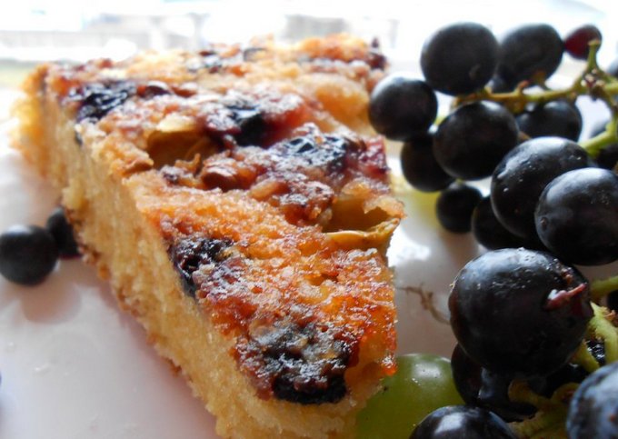 Ингредиенты: 1,5 стакана муки + 1 ст/л для обваливания винограда 3/4 стакана сухого белого вина 2 стакана винограда 1/4 стакана сахара 1/2 стакана меда 2 яйца 85 гр сливочного масла 1,5 ч.л. разры…