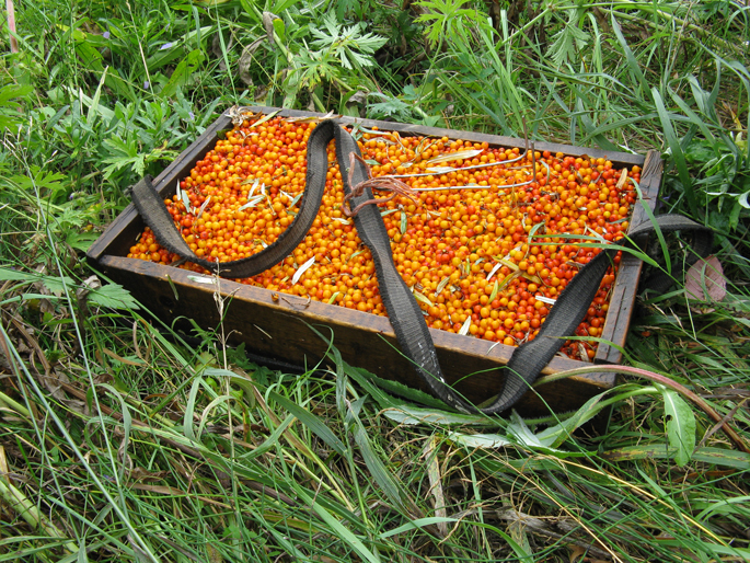 Между тем есть промышленный сбор плодов облепихи. Для этого под кустиками расстилают пленку после первых заморозков, и легонько ударяя па