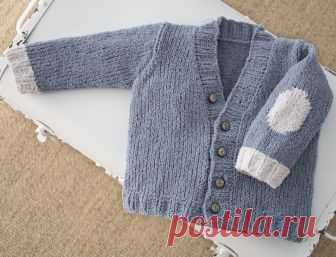 Милый детский кардиган Стильный кардиган с вывязанными «заплатками» на рукавах связан из пряжи с большим содержанием полиамида, что обеспечивает его фактурность.