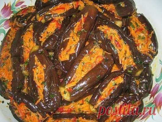 "Манзаны" фаршированные баклажаны по-гречески Ингредиенты: Баклажаны — 15 кг., Морковь — 5 кг., перец болгарский — 2 кг., петрушка — 500 гр., чеснок — 500 гр. ( чеснок можно и 1 кг., по вашему вкусу) соль четыре горсточки. Приготовление: Баклажаны помыть, аккуратно отрезать плодоножку, с одной стороны, в середине сделать надрез 5 см., отварить до готовности, отдельно маленькие, а затем крупные, вареные баклажаны нужно остудить в проточной холодной воде, выложить на лежащую наклонно доску ряда