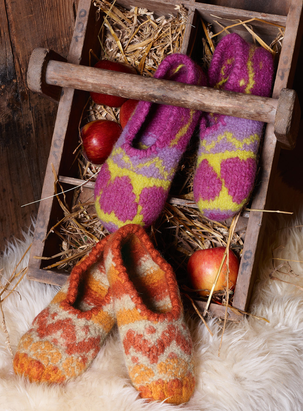 ЯРКИЕ ЦВЕТНЫЕ ТАПОЧКИ С ЭФФЕКТОМ "ВАЛЯНИЯ" СВОИМИ РУКАМИ Что вам больше по душе — сердечки или зигзаги? Выбирайте любой узор! Эти тапочки сначала связаны на спицах, а после выстираны в стиральной машинке, что обеспечивает «валяный» эффект. Размеры 39 Вам потребуется Пряжа (100% овечьей шерсти, 50 м/50 г) — по 100 г оранжевой и меланжевой бежевой, 50 г цвета меди для тапочек А; 100 г пурпурно-розовой, по 50 г желтой и цвета вереска для тапочек В; спицы №8; комплект чуло...