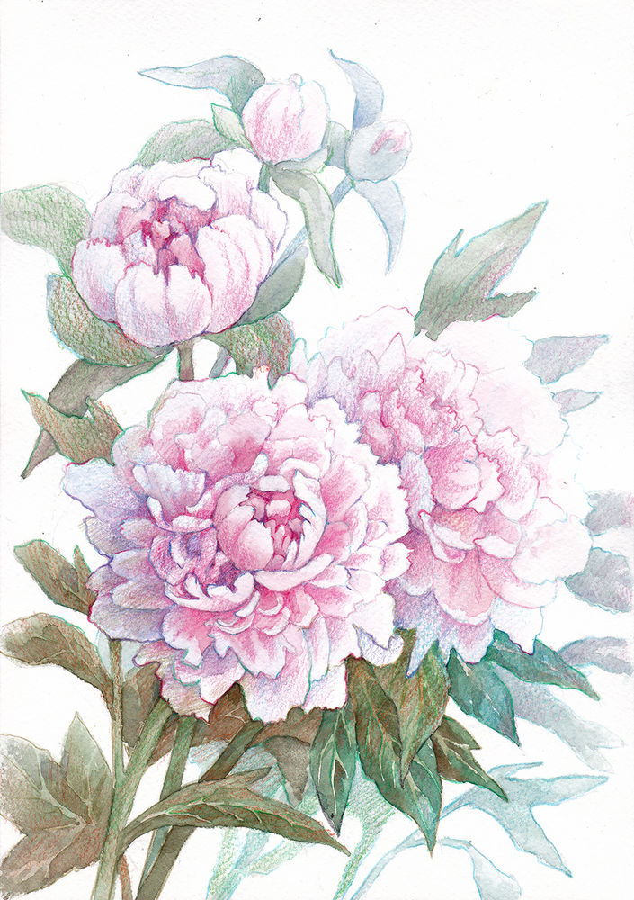 Реалистичное изображение розовых пионов в смешанной технике (акварель и цветные карандаши) – Ярмарка Мастеров