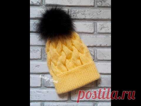 Яркая шапка из ангоры с узором из кос. Hat, knitting.